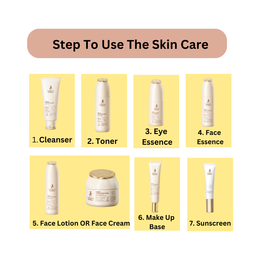 Wash face with Facial Cleanser 2) Use Toner with Cotton Pad 3) Use Eye Serum surrounding your eyes 4) Apply Face Serum 5) Apply Moisturizer Milk or Cream 6) Apply Barrier Cream.